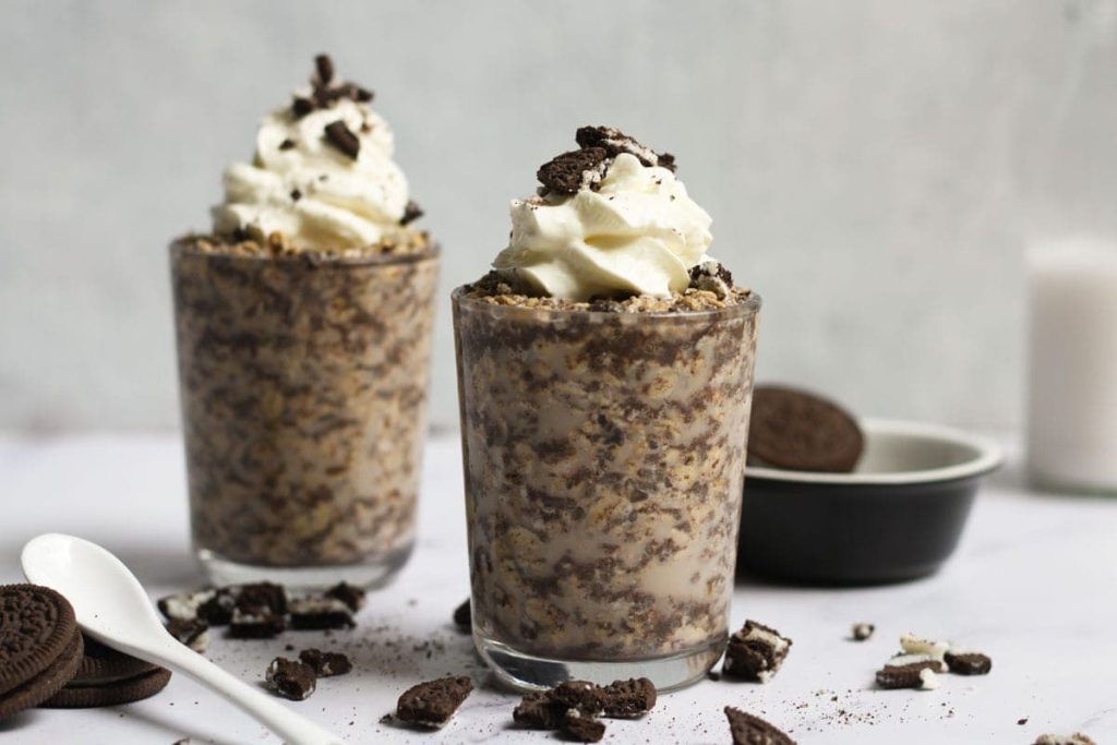 Sie können diese appetitlichen Einzelportionen mit Oreo-Kekskrümeln oder ganzen Keksen garniert servieren.