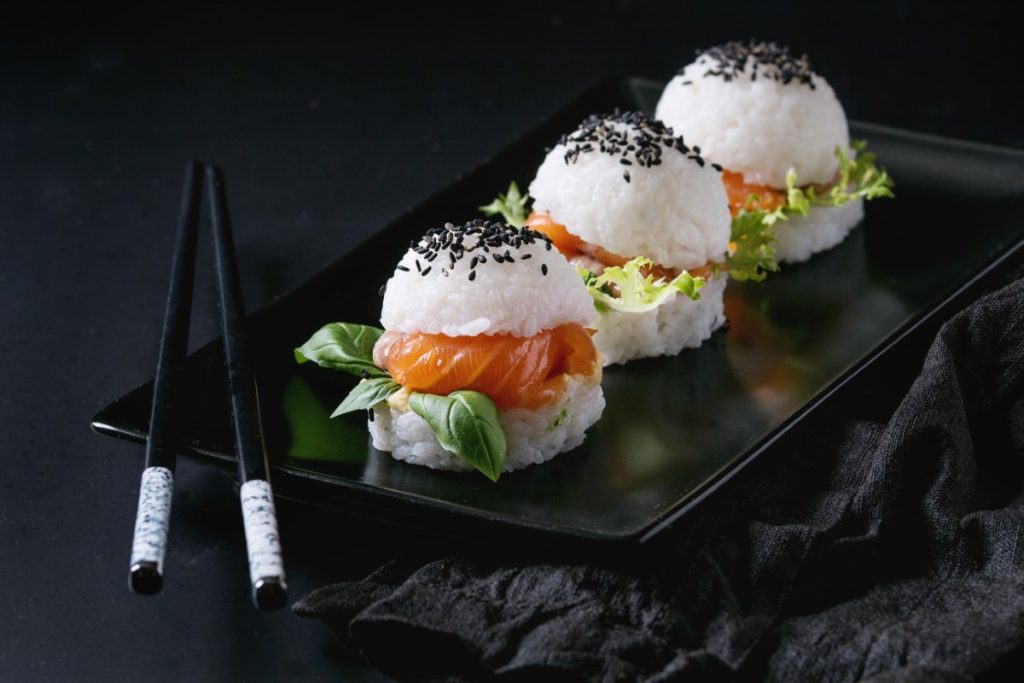 - Formen Sie eine faustgroße Reisbällchen und legen Sie eine Handvoll Lachs in die Mitte.